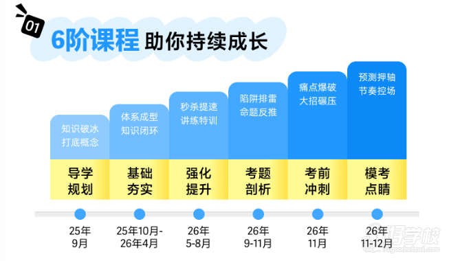全周期科学规划:覆盖 2025.09-2026.12 备考全阶段,通过 6 阶课程梯度推进,从导学规划到模考点睛,匹配不同备考时期需求,解决备考拖延、内耗、盲目等问题。
