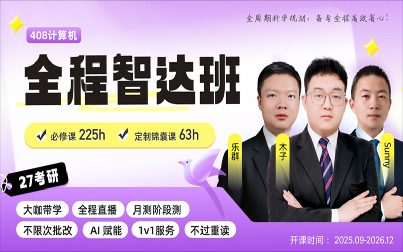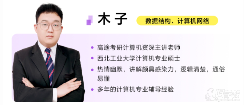 主讲老师木子:高途考研计算机资深主讲老师,西北工业大学计算机专业硕士,热情幽默,讲解有感染力,逻辑清晰、通俗易懂,有多年计算机专业辅导经验,负责数据结构、计算机网络教学。
