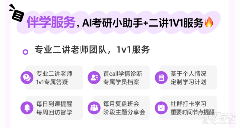 1V1 服务:二讲老师提供 1V1 专属答疑、首 call 学情诊断,为学员建立专属档案,定制学习计划,还有每日到课提醒、每周回访督学、每月复盘班会、阶段主题分享会等服务,主观题可享受不限次 1V1 批改。