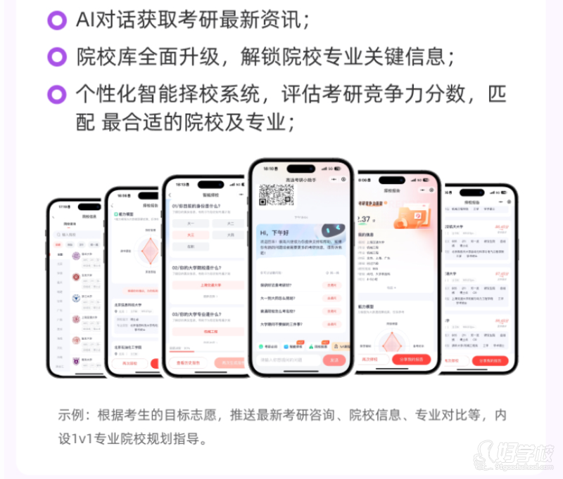 择校助力:有 AI 对话获取考研新资讯,院校库全面升级,能解锁院校专业关键信息;个性化智能择校系统可评估考研竞争力分数,匹配合适院校及专业,还提供考研择校规划课和 1V1 专业院校规划指导。