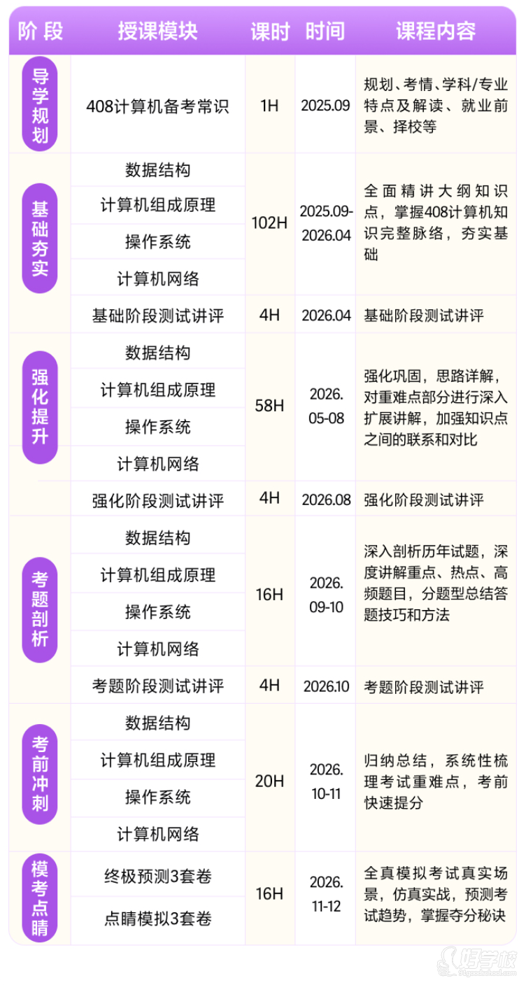 基础夯实阶段(2025.09-2026.04,102H):全面精讲数据结构、计算机组成原理、操作系统、计算机网络的大纲知识点,还包含 4H 的基础阶段测试讲评。