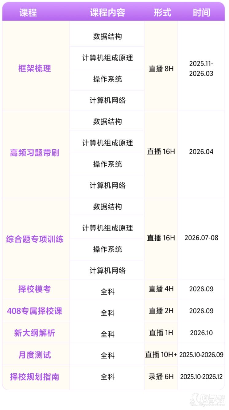 其他课程:包含 4H 择校模考(2026.09,全科直播)、2H408 专属择校课(2026.09,全科直播)、1H 新大纲解析(2026.10,全科直播)、10H 月度测试(2025.10-2026.09,全科直播)、6H 择校规划指南(2025.10-2026.12,全科录播)。