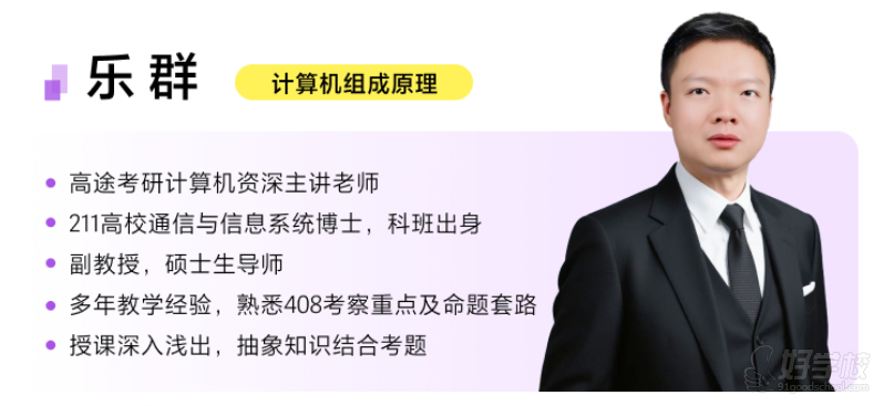 乐群:高途考研计算机资深主讲老师,211 高校通信与信息系统博士,科班出身,副教授、硕士生导师,熟悉 408 考察重点及试题套路,授课深入浅出,负责计算机组成原理教学。