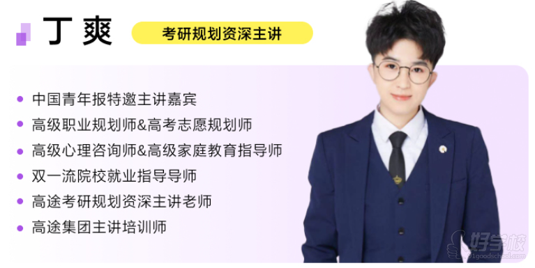 丁爽:考研规划资深主讲,中国青年报特邀主讲嘉宾,拥有高级职业规划师、高考志愿规划师等多重身份,是双一流院校就业指导导师,负责考研规划相关教学。