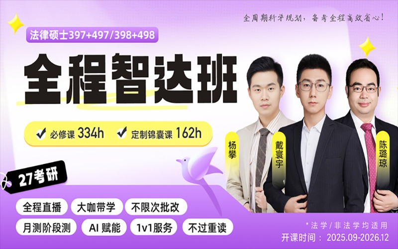 27 考研法律硕士全程智达班,覆盖法学与非法学考生,以 “全周期科学规划 + 大咖带学 + AI 赋能 + 1V1 服务” 为核心,提供从 2025 年 9 月至 2026 年 12 月的系统备考支持,助力考生高效突破复习瓶颈,轻松应对考研竞争。