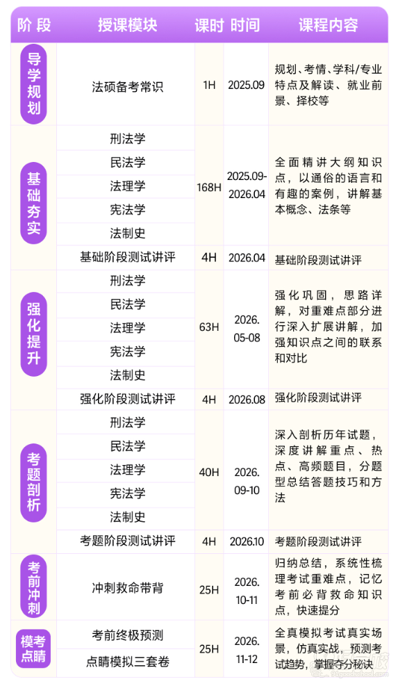 基础夯实阶段(2025 年 9 月 - 2026 年 4 月,168 小时):全面精讲刑法学、民法学、法理学、宪法学、法制史大纲知识点,结合通俗语言与趣味案例拆解基础概念和法条;2026 年 4 月配套 4 小时基础阶段测试讲评,及时查漏补缺。