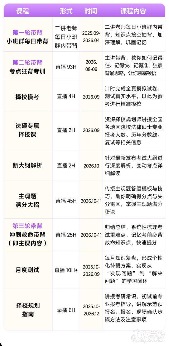 多轮带背服务:2025 年 9 月 - 2026 年 4 月,二讲老师在小班群每日带背,通过知识点挖空抽背加深记忆;2026 年 8-9 月,主讲老师开展 93 小时直播带背,传授独特背诵思路,解决 “记不住、记不牢” 问题;2026 年 10-11 月,结合主课进行第三轮冲刺救命带背。