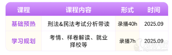基础预热(40 小时,2025 年 9 月):带读刑法与民法考试分析,帮助零基础考生快速入门。