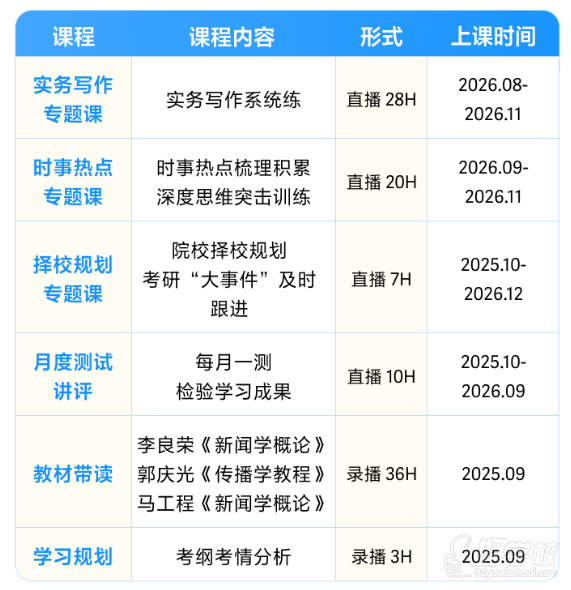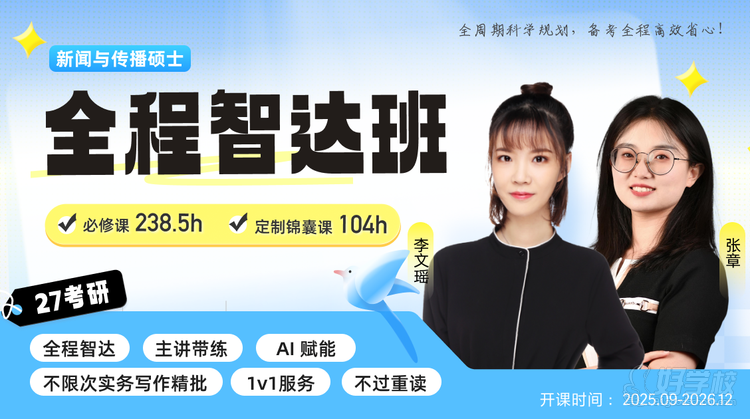 27 考研新闻与传播硕士全程智达班,是专为 27 届新传考研考生设计的长线备考课程,课程周期从 2025 年 9 月 1 日持续至 2026 年 12 月 15 日,共 173 课节,定价 7980 元,当前可直接报名。