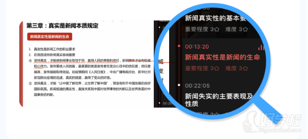 高途方案:🎉视频侧栏展示本节知识,快速跳转至对应位置示例内容:第三章:真实是新闻本质规定(新闻真实性是新闻的生命)、新闻真实性的基本要(重要程度 3☆ 难度 3☆)、新闻失实的主要表现及性质等时间节点展示