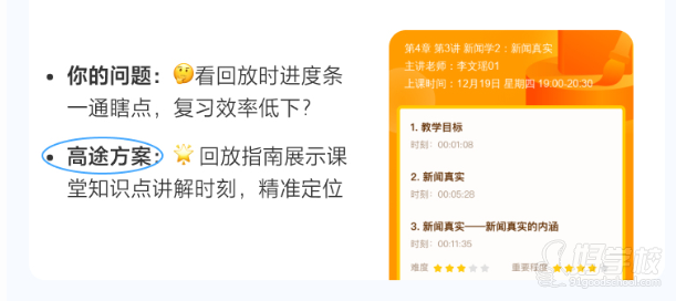 高途方案:🎉回放指南展示课堂知识点讲解时刻,精准定位示例内容:第 4 章 第 3 讲 新闻学 2:新闻真实(主讲老师:李文娟 01,上课时间:12 月 19 日 星期四 19:00-20:30),包含教学目标、新闻真实、新闻真实 —— 新闻真实的内涵的时间节点(00:00:08、00:06:28、00:11:35)及难度、重要程度星级展示
