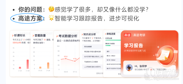 高途方案:🎉智能学习跟踪报告,进步可视化包含听课时长、答题数量、考试数据分析、知识分析、课程进度等图表及 “高途 高途考研 学习报告”(如 H4,张同学 你已经累计学习了 36 天,继续加油哦!)