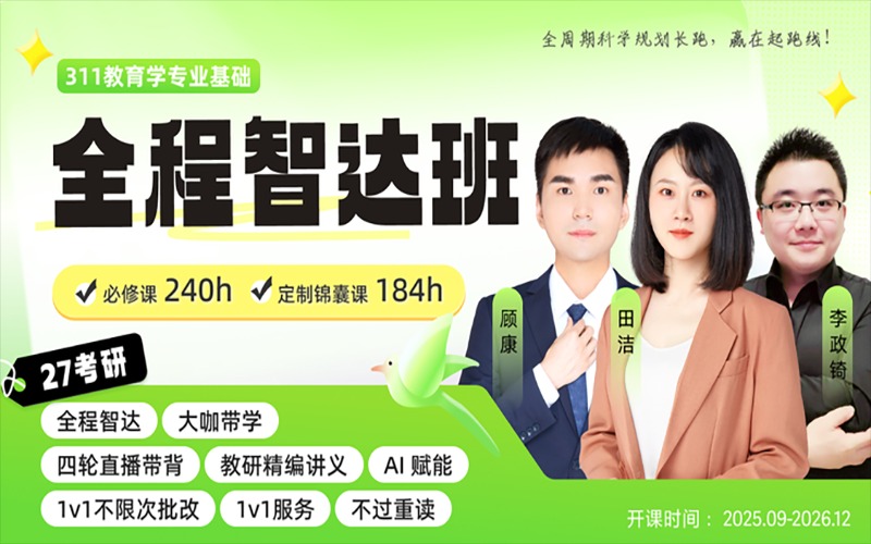 27 考研 311 教育学专业基础全程智达班,以 “全周期科学规划” 为核心,提供从 2025 年 9 月至 2026 年 12 月的长线备考支持,搭配大咖带学、AI 赋能与 1V1 服务,助力考生高效备战, “不过重读”,降低备考风险。