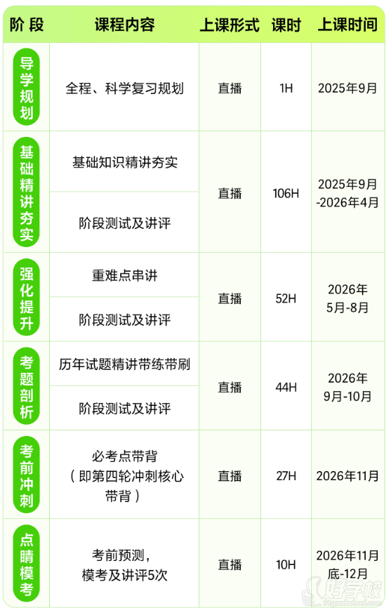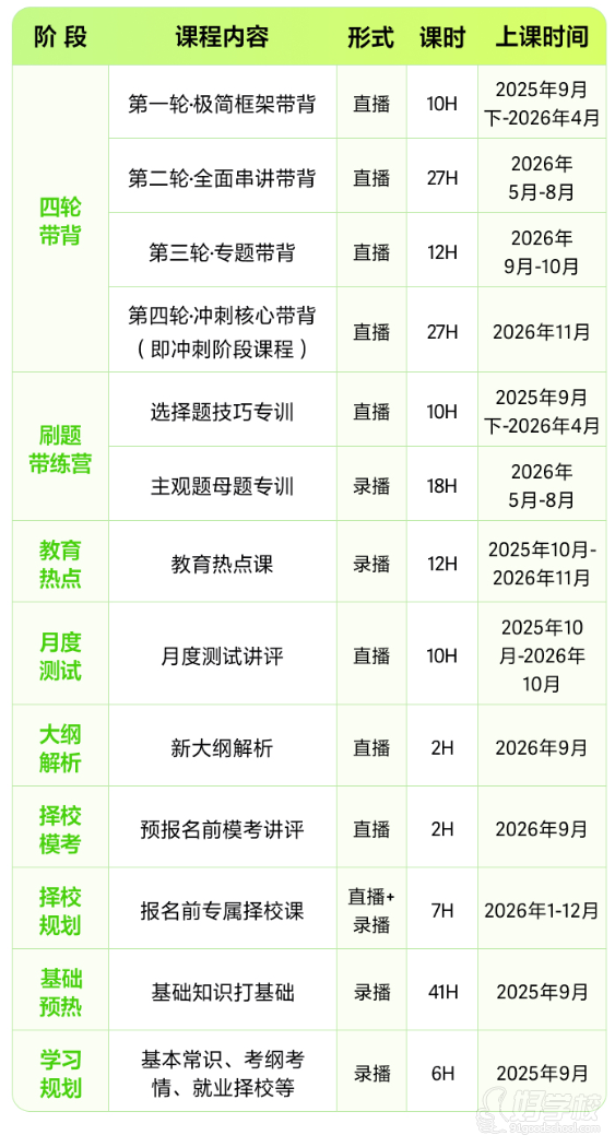 四轮带背:2025 年 9 月下 - 2026 年 11 月分阶段推进,从 “极简框架带背” 到 “冲刺核心带背”,逐步深化知识记忆,总时长 76 小时,以直播为主。