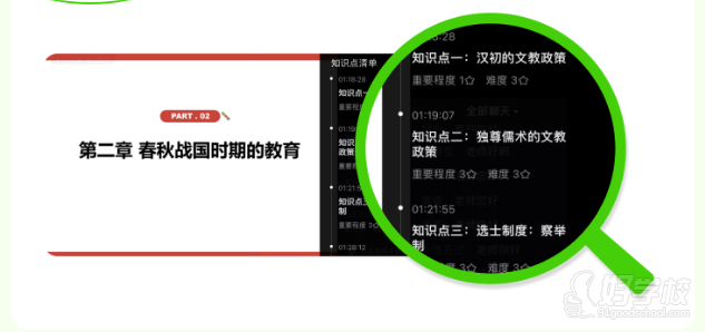 智能打点系统:视频侧栏标注知识点及对应时间,考生可快速跳转至目标内容,避免无效观看,提升学习效率。