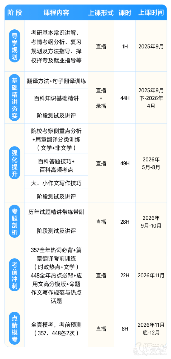 强化提升(2026 年 5-8 月,49H 直播):分析院校考察重点,开展篇章翻译分类训练(文学 + 非文学),讲解百科答题技巧与高频考点、大小作文写作技巧。