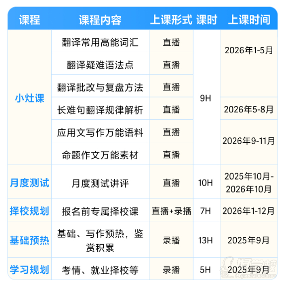 小灶课(2026 年 1-11 月):涵盖翻译常用高能词汇、疑难语法点、长难句翻译规律、应用文写作语料、作文素材等,分阶段直播讲解。