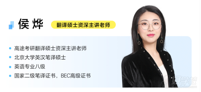侯烨:高途考研翻译硕士资深主讲,北京大学英汉笔译硕士,持有英语专业八级、国家二级笔译证书、BEC 高级证书,深耕翻译教学。