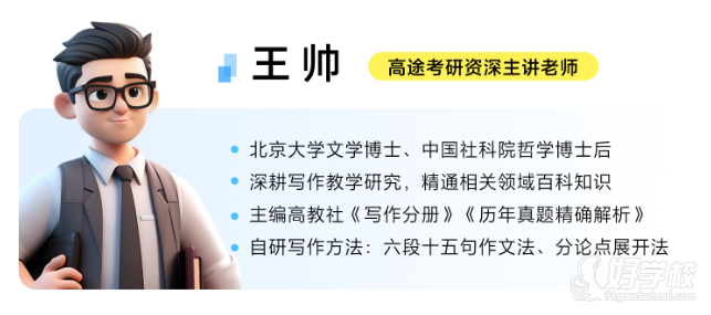 王帅:高途考研资深主讲,北京大学文学博士、中国社科院哲学博士后,精通百科知识,主编《写作分册》《历年真题精确解析》,独创 “六段十五句作文法”“分论点展开法”。