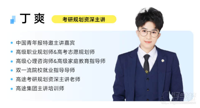 丁爽:考研规划资深主讲,中国青年报特邀嘉宾,高级职业规划师、高考志愿规划师、心理咨询师,擅长考研全周期规划指导。