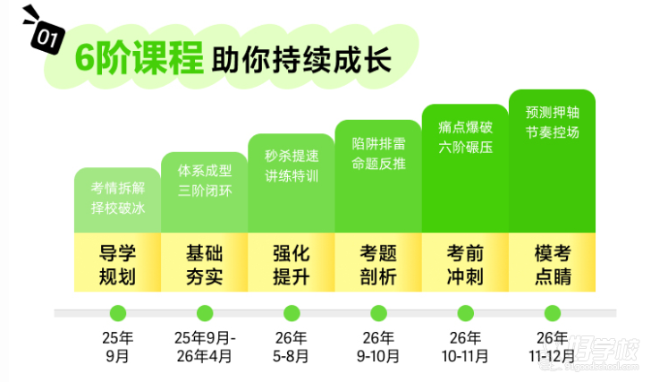 择校与测试支持:开设择校规划专题课(2025 年 10 月 - 2026 年 12 月,7 小时直播),结合 AI 智能择校系统,评估考生竞争力、匹配合适院校,提供 1V1 院校规划指导;备考全程含多维测试,包括 3 次阶段测试、1 次基础预热测试、10 次月度测试、2 次模考点睛测试,所有测试均有大咖主讲讲评。