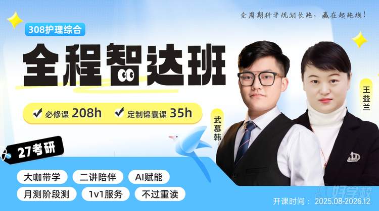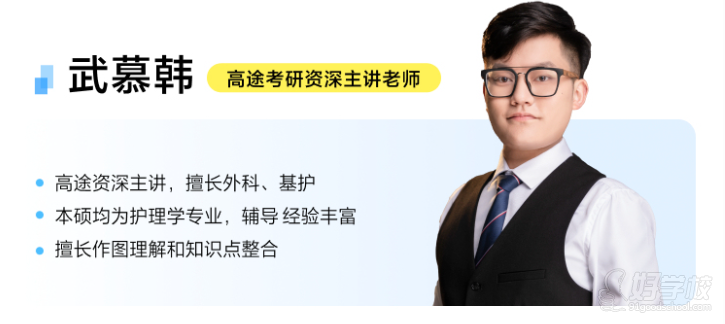 武慕韩:高途考研资深主讲老师,本硕均为护理学专业,辅导经验丰富,擅长外科、基护教学,注重作图理解与知识点整合。