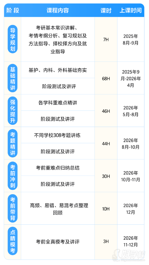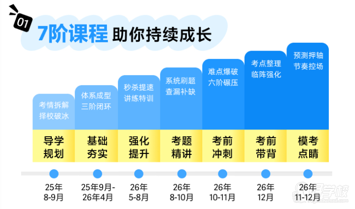 强化提升(2026 年 5 月 - 8 月,46 小时):深入讲解各学科重难点,搭配阶段测试与讲评,强化知识掌握。
