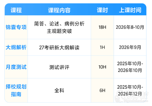 锦囊专项(2026 年 8-10 月,18 小时):针对简答、论述、病例分析等主观题,提供专项突破指导,帮助掌握难点得分点。