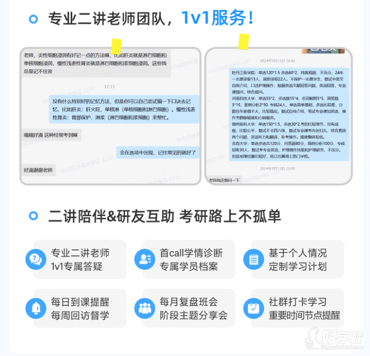 配备 A + 级专业二讲老师团队,均为医学专业背景,提供 1v1 专属答疑,同时定期开展每月复盘班会、每周回访督学、阶段主题分享会。