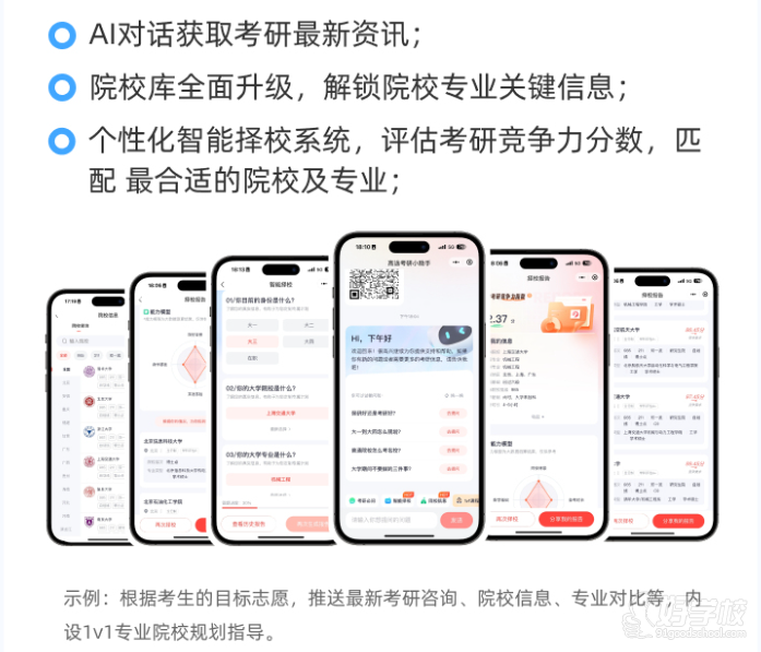 提供智能学习跟踪报告,让学习进步可视化,同时搭载智能择校系统,可评估考研竞争力分数,匹配合适院校及专业,推送新考研资讯与院校信息。