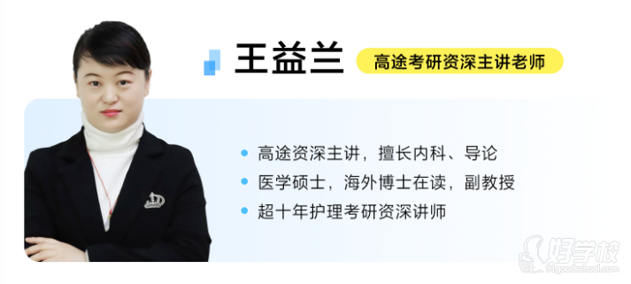 王益兰:高途考研资深主讲老师,医学硕士、海外博士在读,副教授职称,拥有超十年护理考研辅导经验,擅长内科、导论教学。