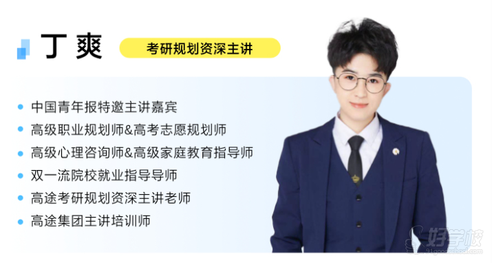 丁爽:考研规划资深主讲老师,中国青年报特邀主讲嘉宾,同时具备高级职业规划师、高考志愿规划师、心理咨询师等资质,负责考研规划指导。