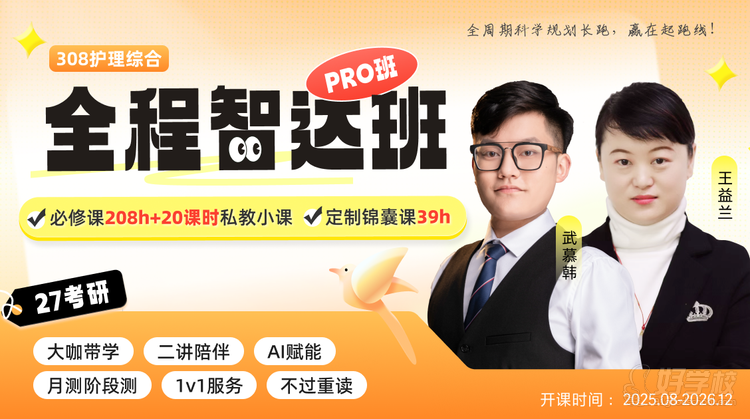 27 考研护理硕士 308 护理综合全程智达 PRO 班由高途考研推出,以 “全周期科学规划长跑,赢在起跑线” 为核心,助力考生高效备考,课程定价 11980 元,开课时间为 2025 年 8 月至 2026 年 12 月,还提供 “不过重读” ,为考生上岸保驾护航。