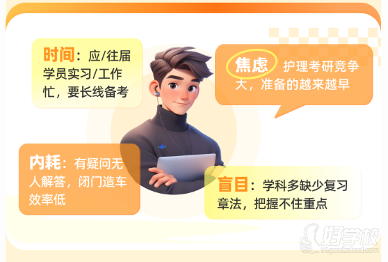 2. 面对护理考研竞争激烈、备考焦虑,存在疑问无人解答、学科多且复习无章法、效率低等问题的考生。