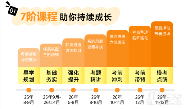 课程构建 7 阶进阶体系,涵盖导学规划、基础夯实、强化提升、考题精讲、考前冲刺、考前带背、模考点睛 7 个阶段,各阶段紧密衔接,确保内、外科,基护、导论等学科复习有效果。