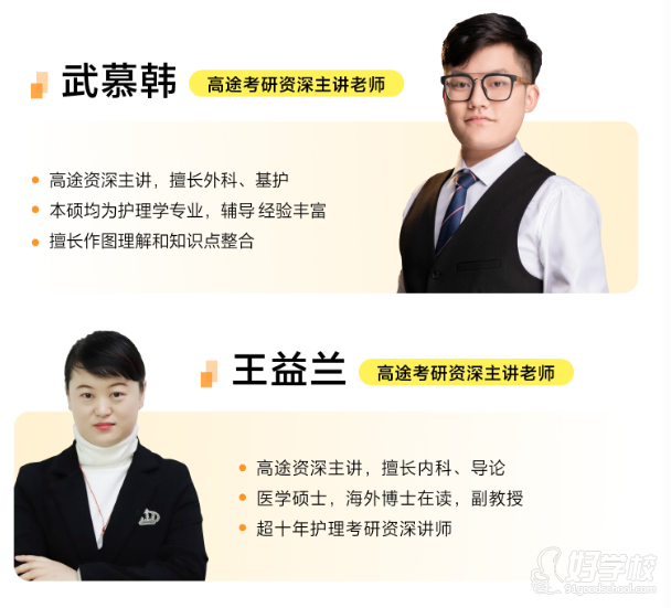 大咖主讲:武慕韩是高途考研资深主讲老师,本硕均为护理学专业,辅导经验丰富,擅长外科、基护教学,且善于作图理解和知识点整合;王益兰同样是高途考研资深主讲老师,医学硕士、海外博士在读,副教授职称,拥有超十年护理考研资深讲师经验,擅长内科、导论教学;
