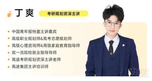 丁爽为考研规划资深主讲,是中国青年报特邀主讲嘉宾,同时担任高级职业规划师、高考志愿规划师、心理咨询师、家庭教育指导师及双一流院校就业指导导师,负责考研规划相关教学。