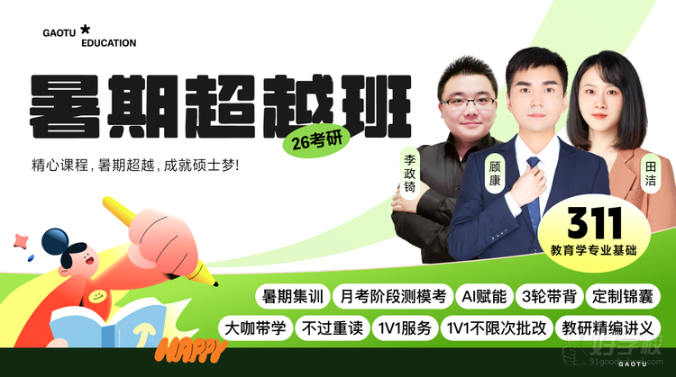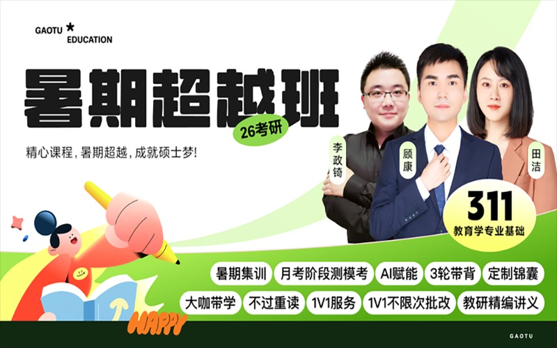高途 26 考研 311 教育学专业基础暑期超越班,以 “暑期超越,成就硕士梦” 为目标,整合大咖师资、多阶段课程、三轮带背、专属伴学等资源,解决考研 er 知识多、记忆难、答题弱等核心痛点,助力高效备考。