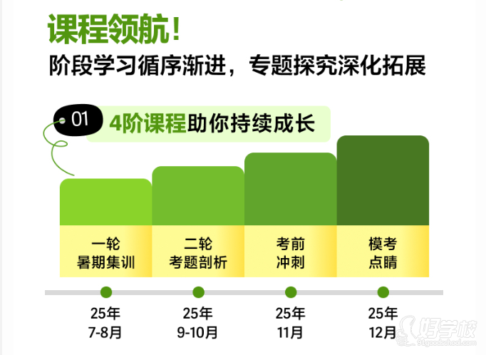 课程按备考进度分为 4 个阶段,循序渐进覆盖考点,搭配专题锦囊课强化应试能力。