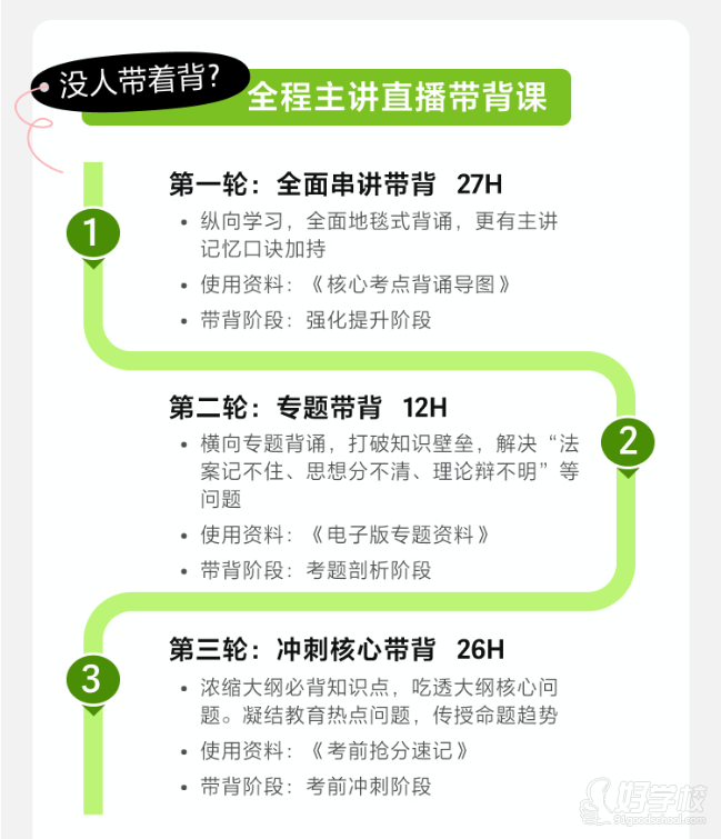 三轮带背课:首轮 27 课时全面地毯式背诵,用记忆口诀辅助;第二轮 12 课时横向专题背诵,打破知识壁垒;第三轮 26 课时浓缩核心考点,结合热点传授试题趋势。
