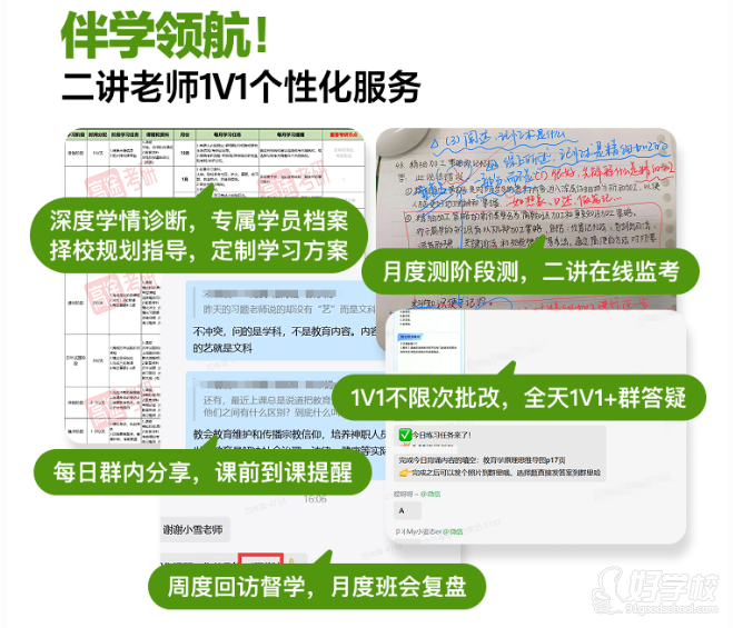 伴学服务:二讲老师 24 小时内建立联系,7 个工作日内完成学情诊断与入学登记,定制专属学习计划;日常提供 1V1 不限次答疑批改、每日带练提醒、每周回访督学、每月班会复盘,重要时间节点实时通知。