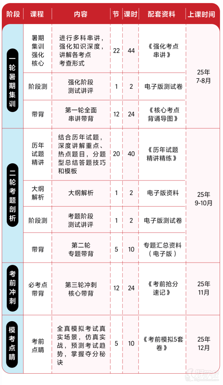 全阶段系统化教学:分 4 阶推进学习,从 25 年 7-8 月暑期集训打基础,到 9-10 月考题剖析深化,11 月考前冲刺聚焦核心,12 月模考点睛实战,循序渐进覆盖备考全周期。