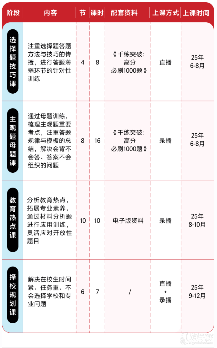 教育热点课(10 课时,25 年 8-10 月录播):分析热点并结合材料题训练,拓展专业素养应对开放性题目。