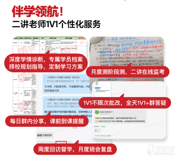 双师伴学服务:大咖主讲团队(顾康、李政锜等北师大硕士)负责课中核心授课,1% 选拔通过的二讲老师提供课后 1V1 答疑、不限次批改,还有每日带背带练、周回访督学、月度班会复盘。