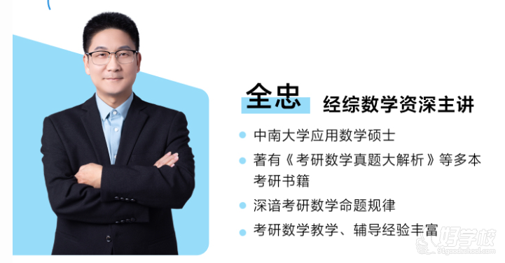 全忠:经综数学资深主讲,中南大学应用数学硕士,著有《考研数学真题大解析》,深谙试题规律,教学经验丰富。