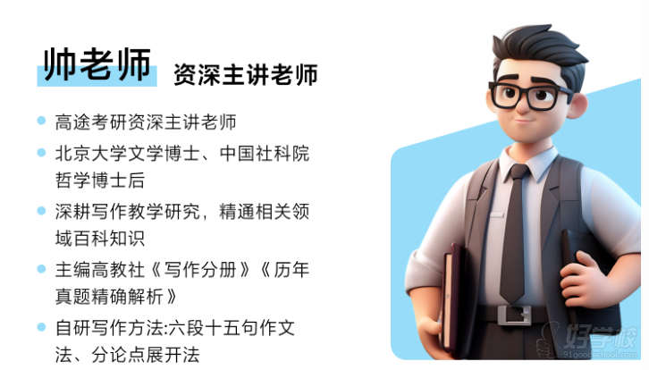 王帅(帅老师):高途考研资深主讲,北京大学文学博士、中国社科院哲学博士后,主编《写作分册》,独创 “六段十五句作文法”“分论点展开法”。