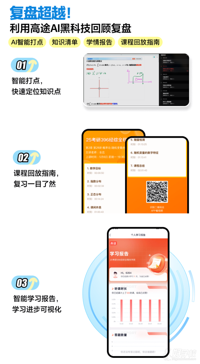 智能学习报告:可视化呈现听课时长、答题数量、学习进度,帮助学员了解自身学习情况。