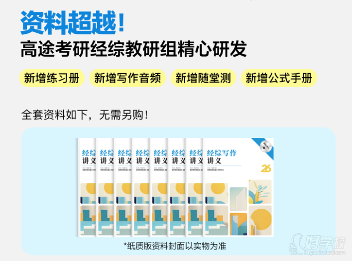 资料全配套:由高途经综教研组研发全套资料,无需额外购买,涵盖纸质讲义、练习册、公式手册、写作音频及电子版阶段测资料,分批邮寄至学员。