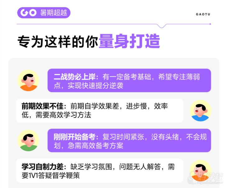针对性适配人群:包括二战想上岸(有基础,需突破薄弱点)、前期备考效果差(自学效率低,需高效方法)、刚启动备考(时间紧,缺规划)、自制力弱(缺氛围,需答疑督学)的考生。