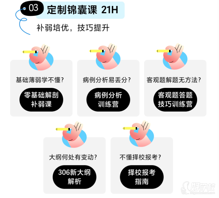 针对考生薄弱环节专项提升,共 21H,覆盖基础补弱、解题技巧与报考指导。